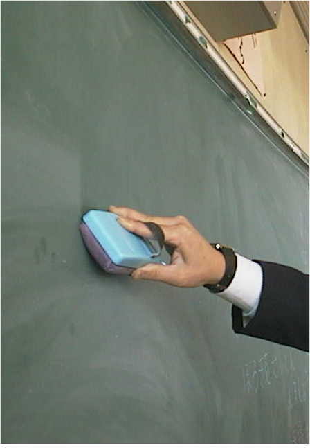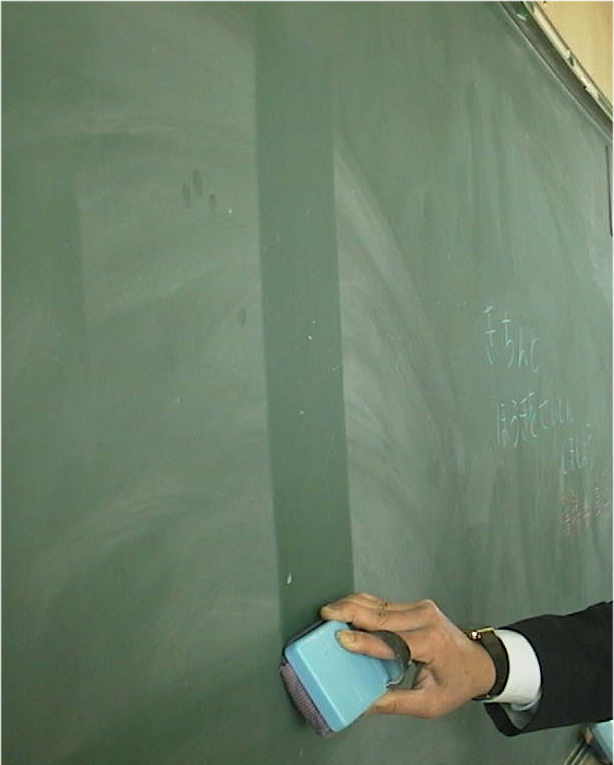 私は,黒板は「上から下に縦に消す」ことを基本としています。横に消すこともありますが,その場合も最後は縦に消し直します。「上から下に縦」に消すと黒板が締まって見える(少なくとも私には)からです。また,チョークの粉も自然に下に落ちていき,便利です。