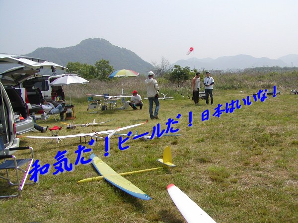 2008年8月 5月の連休に合わせて帰国。 今年からF5BがLipo化しUniLogでリミッターを掛けるとのこと。 連休明け5月末の大会に備えてデーター取りに精を出します。 何とかデーターは取れましたが・・・・。 UniLogのバグで大会延期。私の5月連休はなんじゃったん? 08年5月 2007年度F3J日本選手権 参加することに意義がある!てなわけで坂井さん、新階さん、黒岩さん(初参加) 藤木さん、阪本さんと参加。 昨年10月が台風で滑空場水没で延期になり、年が明けてで開催で、 丁度春節のお休みと重なりラッキーでしたが、結果は??? 初参加のJR黒岩さんが見事2位。その他惨敗の結果でした。 2008年2月 2月の春節に帰っていきなりトラぶったら間に合わないので 今回はJ機の確認フライト。 1月5日和気滑空場 今年の初フライトは和気でさせていただきました。 今日は天候も穏やかで暖かくすごしやすい1日でした。 いつもここに来ると、早く帰国したくなります。 いつもながら空気もおいしい、ビールもうまい。 日本は最高です。 日本は寒い寒いといっても、とてもすごし易いです。(瀬戸内はです。) 中国大陸は正直大きな盆地です。特に南京は長江のほとりの大きな盆地です。 夏場は40度近く、冬は-5度は当たり前のように続きます。 なにが堪えるかというと、すっご底冷えです。足元から深々と冷えてきます。 広島の瀬戸内に育った体にはとてもつらい日々です。 やっぱり日本はいいな〜。お正月に帰れてよかった! 2008年1月 2007年F5B日本選手権