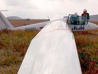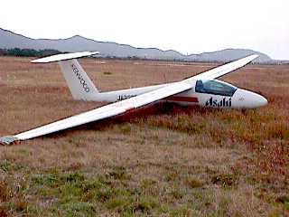 日本の空をまたに掛けて飛びわたってきた、ス−パ−B4です。元々は千葉工業大学の所有機で学生時代は、よく合宿でお目にかかっていた機体です。その後、アクロバットソアリングチ−ムの所有となり、そのときに付けられたAsahiス−パ−ドライの文字は、今でも健在です。