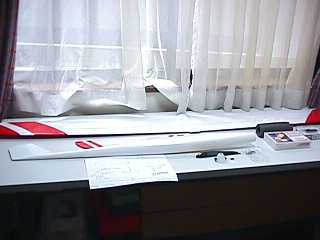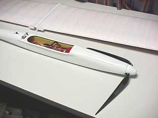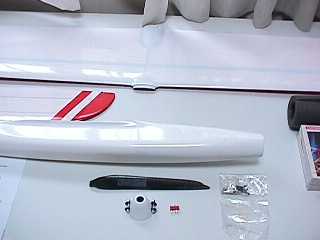 昨年(’99)の西日本電動グライダ−大会(錦海)で目にして以来、いつかはこの機体でF5Bをと約1年、とうとう手に入れました。この機体の場合、製作とはとても言えない機体です。サ−ボはすでに機体製作段階でモ−ルドしてあります。ハ−ネスはもちろん、主翼部のコネクタ−までが完成しています。主翼はバルサシャ−レ、カ−ボンスパ−&補強がしてあります。胴体はケブラ−+カ−ボンロ−ビングで補強。