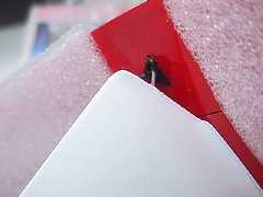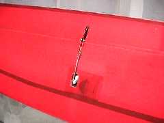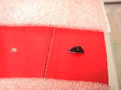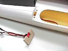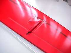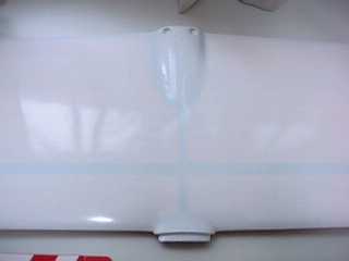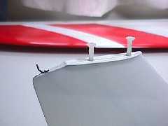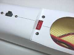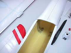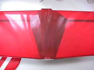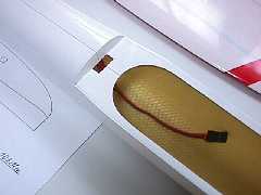 サ−ボははじめからモ−ルドしてありますので、まずサ−ボホ−ンの位置に穴を開けてサ−ボを動かしてサ−ボホ−ンを出します。エルロンホ−ンは付属していたものを利用しました。ニュ−トラルでサ−ボホ−ンは垂直に立ちますので前側にニュ−トラルを替えてリンケ−ジすれば完了です。サ−ボカバ−はこの機体には設定されていないと言うことなので、手持ちの赤いFRP製カバ−を取り付けました。色も大きさもぴったりで、よかった。(^^)