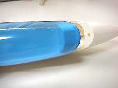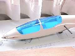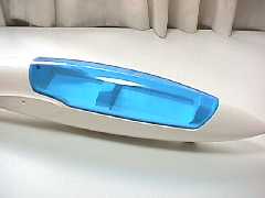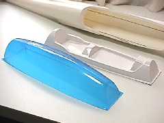 キャノピ−を胴体に合わせて組み立てます。ベ−スはABS製、アクリルのブル−のキャノピ−が入っています。切り取りはケガキ線に沿って切り取っていきますが、最初はベ−スを胴体に合わせてすり合わせします。しかし剛性がないので、裏にヒノキの棒を仮り止めして形を整えます。ベ−スが出来たら、キャノピ−を切り取りベ−スに接着して完成です。