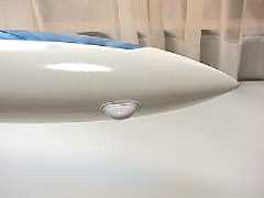 十分サフェ−サ−を乾燥させたら、#400位の耐水ペ−パ−で表面を軽くサンディングします。このときサフェ−サ−をはがさないよう注意して下さい。はがれて下が見えたらもう一度サフェ−サ−を吹き直します。サンディングが終了したら、表面のゴミをティッシュペ−パ−などで綺麗に落とします。間違えてもタオルを使わないように!。塗装時に毛ゴミがたくさん現れます。綺麗に掃除が出来たら、ウレタンを吹き付けていきます。胴体をくるくる回しながら塗装していくと、厚く塗装しても、ナガレが発生しなくなります。(マツダのハイレフコ−トの技)
