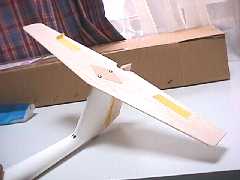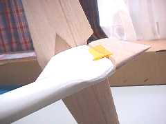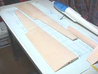 水平安定板、エレベ−タ−、ラダ−はしっかりとした材料が綺麗に切り出されており、簡単に加工できます。安定板の固定部分には菱形のベニアを埋め込んで補強するようになっています。エレベ−タ−は単板ですのでサンディングして形を整えます。ラダ−は胴体の形状に合わせて下側を整形しヒンジ面を山形に整形したら完了です。