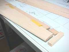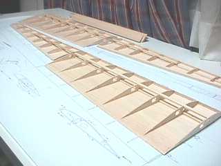主翼はリブ組バルサプランクです。材料はやはり良質なバルサが入っていました。プランク材も1プランク分ずつ加工されています。まず下面を基準に組み立てていきます。後縁側を基準にスパ−の位置を図面に合わせて下面プランク材にけがきスパ−を接着、リブを両端から基準に立てて中を立てていきます。中の加工が終わったら、上面をプランクして外翼と内翼を翼上面が水平になるように接着します。ここまででいったん整形を行い形を整えていきます。