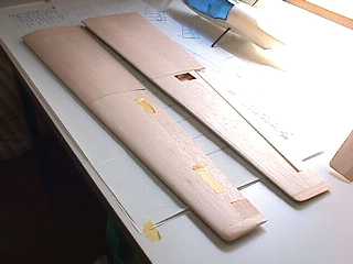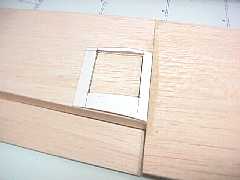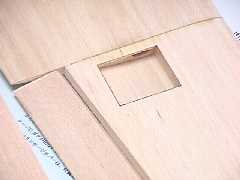 組上がった主翼にエルロンサ−ボを入れる穴を開けますが、図面から型紙をおこしてけがき、切り取ります。切り取った端面には低粘度の瞬間をしみこませておくと、後でクラックが穴の端から入らないでしょう。