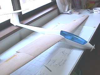 若干改造した点−翼根本のリブ1,2にはすでにカンザシパイプの穴が加工されていますが、仮組で胴体に当てるとやや主翼がWL方向に下がってしまいます。ベニアのル−トリブはきっちりと胴体に合うので、ル−トリブを基準にカンザシパイプの位置を1.5mm下げています。この結果上半角が少なくなるので、外翼を内翼に対して1度上半角を付けました。