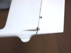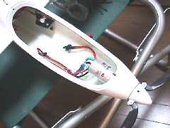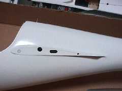 エレベ−タ−、ラダ−ともリンケ−ジパイプが胴体に装着されています。しかしエレベ−タ−は、0.8mmのピアノ線ではガタが出てまた動きも渋いので、垂直尾翼内にGWS5.4gサ−ボを挿入し、ダイレクトリンケ−ジとしました。ラダ−はそのまま流用ですが、ホ−ンをかなり小さく作らないと、胴体のフィレットに当たってしまいます。ここは慎重に工作しました。