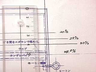 その後の事故調査委員会の調べによると、図面上指示してある重心位置について再度検討をしてみたところ、MACの38.5%というところに重心が指定されており、本来20%前後が安定して飛べる位置とされている数値から大きく外れていることが解りました。(見た目でももう少し考えるとすぐに解りそうなものですが・・・)この機体を安心して飛ばすには、縦安定はある程度あると考えると25%付近からはじめて、様子を見ながら30%まで下げる方が無難だと思います。(写真参照して前縁からの重心位置を決めて下さい) 飛行結果をサ−マル工房さんに連絡したところ、やはり重心位置は図面の指示ミスですとのことでした。結果的には、上述した30%を後ろの限界位置として設定する必要があるようです。修理完了後には、25%から設定してみます。 |