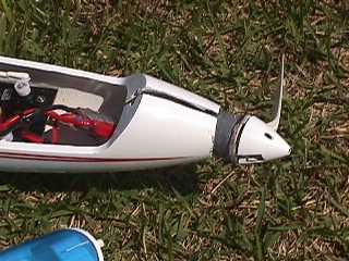 平成12年10月1日午前10時30分ごろ、広島県のとある滑空場にて、操縦者による手投げ後スム−ズな加速を行い、そのまま上空へと思いきや左に急バンク。なんか以前にもあった事故と全く同じ・・・ただロ−ルレ−トは緩やかで当て舵を入れると舵は効くもののハンチング・・・翼端失速。すぐにモ−タ−カットし滑空に入れるも、テ−ルが重い感じで水平にドン着。滑空しない・・・・。バッテリ−を前へ移動して重心を5mm前に移動。やや改善されるも再度同じ症状・・・。さらに前にバッテリ−を移動、これ以上はメカの搭載関係で前に出せない。トリムをダウンに入れて再度投げる直前、ガガガガ−!ペラが折れていました。