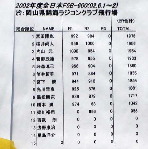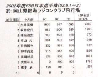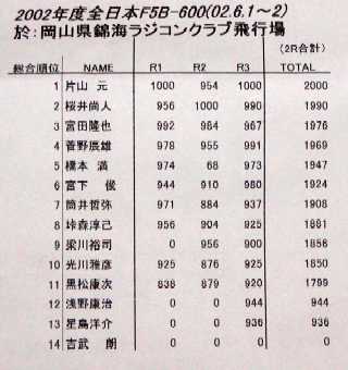 | 第13回全日本F5/10電動グライダー大会 平成14年度模型航空 第11回F5B電動グライダー日本選手権 開催日時:2002.6.1〜2 開催場所:錦海RC飛行場(岡山県邑久郡邑久町) |