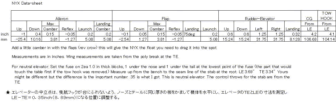 ●セッティングデーターシートを載せてみました。F3X.COMのNYXのページにも出ています。