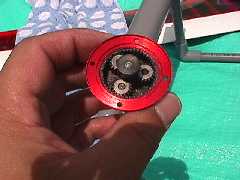 錦海の第9回西日本電動でのスタートでのトラブル。スタート直前モーターON後手投げ寸前にモーター異音。リスタートで再度モーター入れてもペラの回転上がらず、モーターから異音。機体交換修理でピットへ・・・、ペラの緩みかと思いきや、なんとモーターシャフトがピニオンの付け根からポッキリ!。こんなことがあるのかと、この場は予備の機体に切り替えて参加しましたが、現在モーターはKONTRONICに調査入院中です。 |