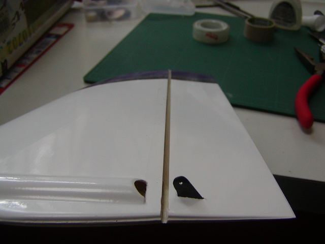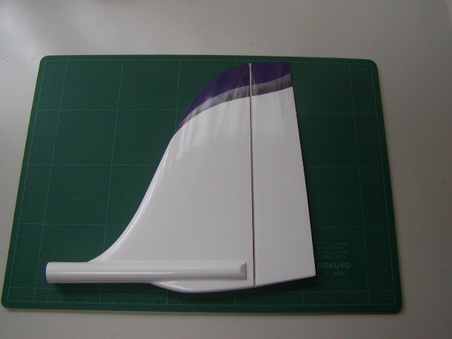 | まずは垂直尾翼。ラダーのファブリックヒンジ部の削りだしが必要です。 |
