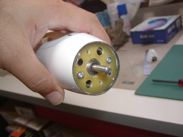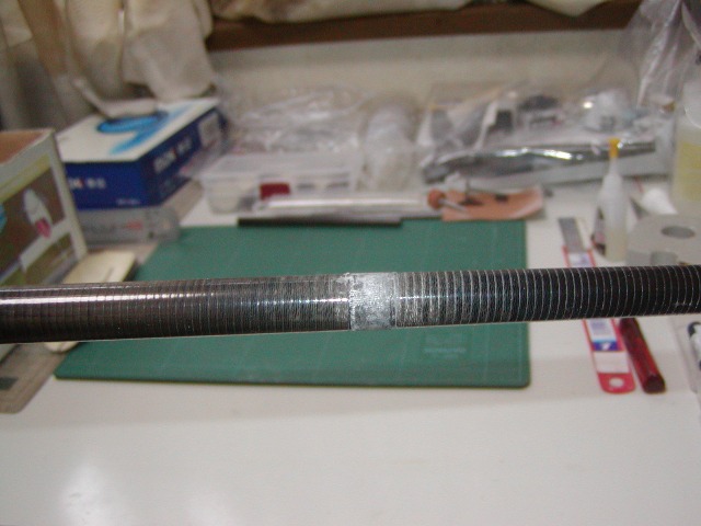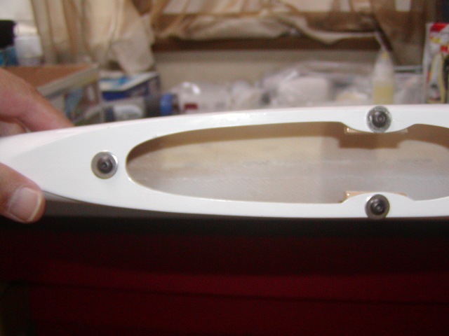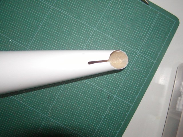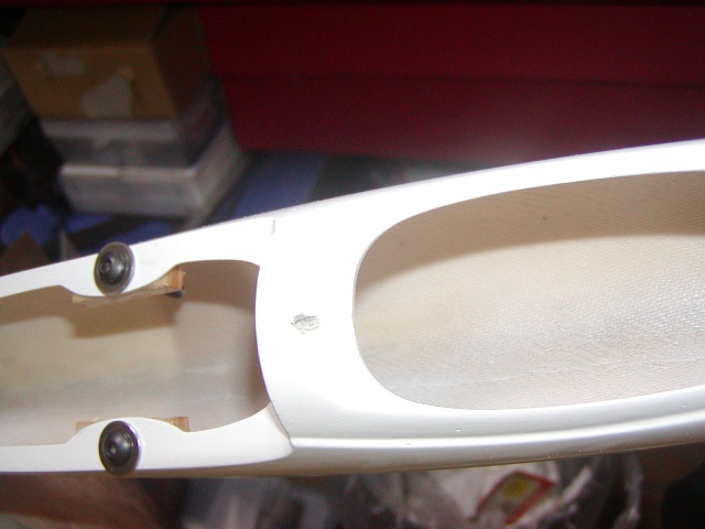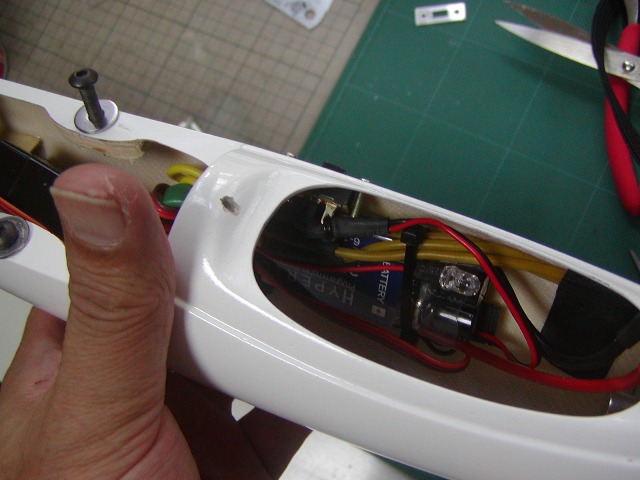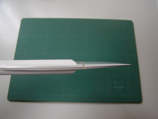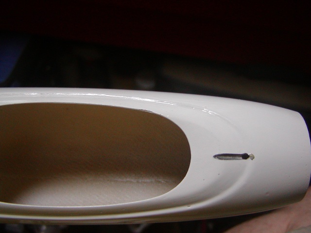 | 胴体ポッドにテールパイプを通すにはいくら内面を削っても無理です。 写真のような溝を切ってパイプで少し広がるように加工します。 |