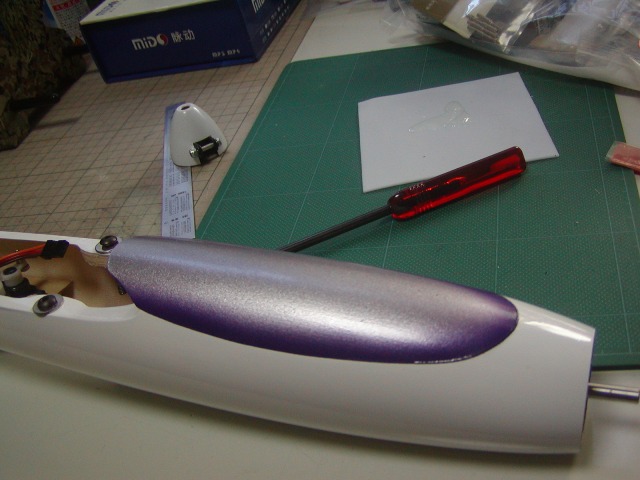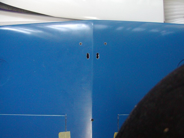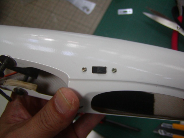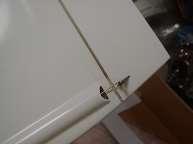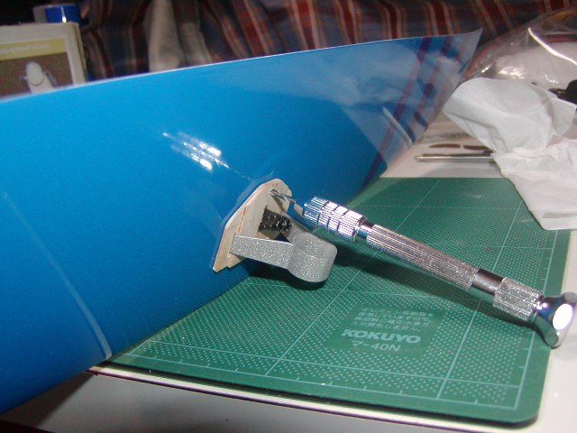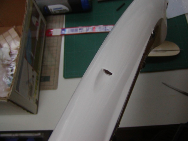 | ラダーホーンとリンケージを通す穴を加工します。また、隙間に透明ギャップシールを施します。 |