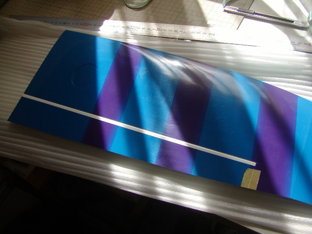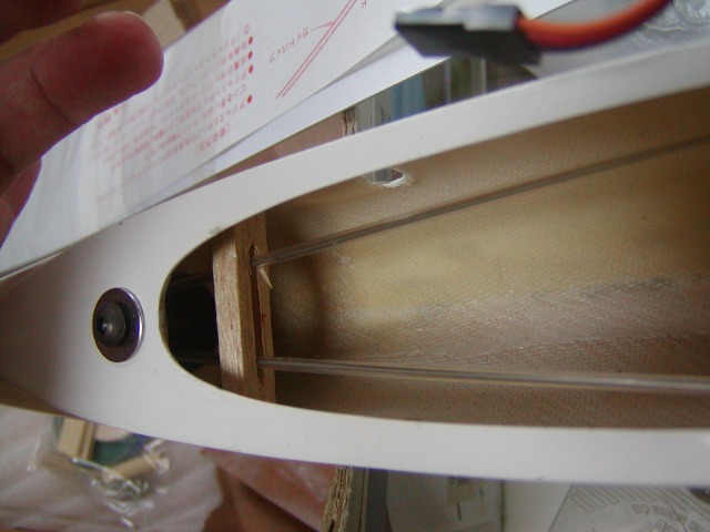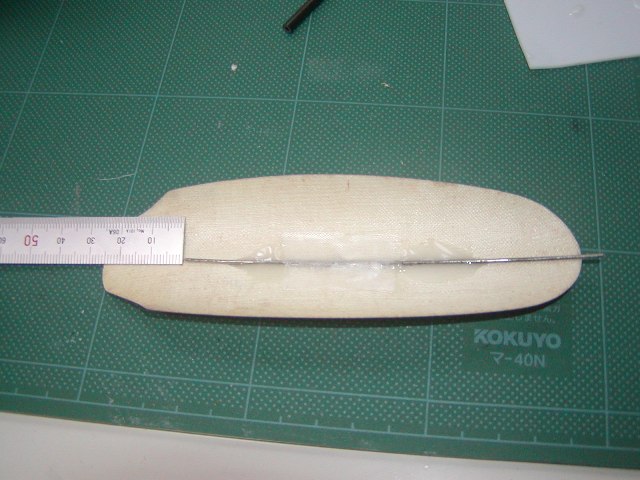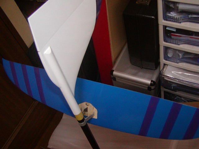 | 中央翼を胴体につけて水平のアライメントを出しVマウントをエポキシ固定します。 また、この時テールパイプ内にラダー用のリンケージパイプの後ろエンドをバルサ材を 加工して固定しておきます。 |