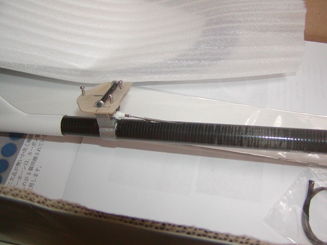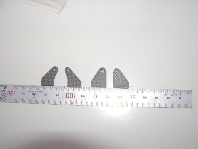| まず、ホーンを切り出します。ロットによって差があるようで、前回製作の2機はカーボン製の写真の ようなホーンが付いてきましたが、今回はアルミの2.5mm棒タイプ。 好きでないので1.2mmカーボンから切り出しました。 |