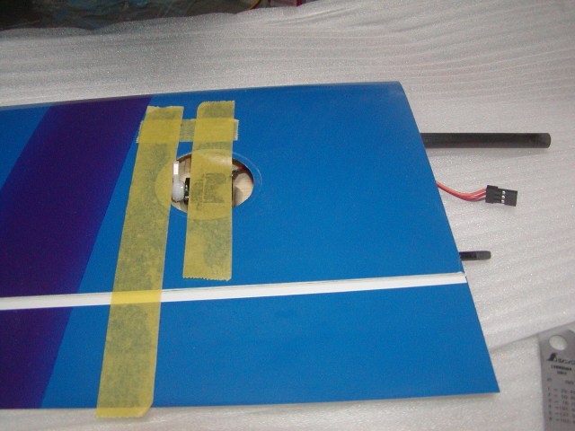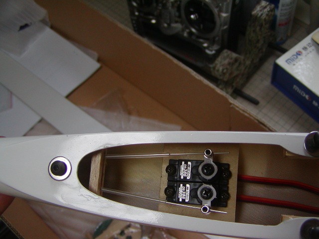 | エルロンサーボを取り付けていきますが、アライメントをしっかりと出して固定します。 5分間エポキシでかっちり固定。 |