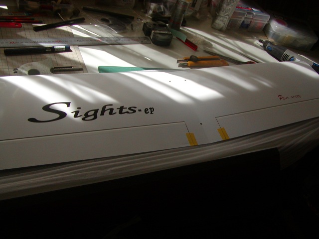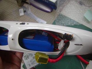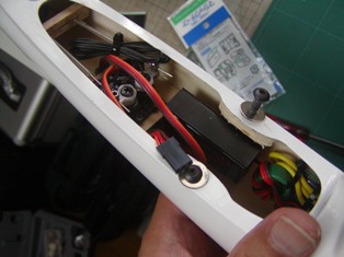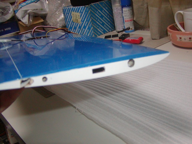 | ちょっとぼけていますが、エルロンのリードを差し込むメス側を中央翼に固定しリード線を中央部 から出して作業完了です。(ここまででおしまい) サーボカバーはM氏が加工したいそうなのでこれにて終了です。 サーボは見てのとおり主翼から出ませんので、サーマル工房の小型サーボカバーでOKです。 以上、製作記録です。 |