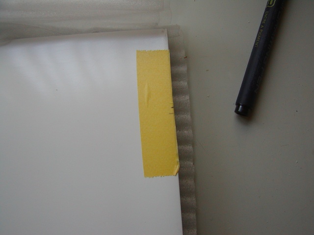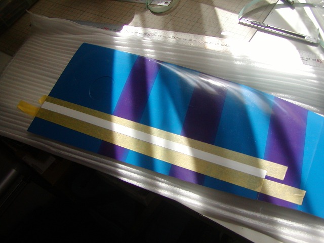 | ギャップシールを貼ります。テプラーのテープを使っています。 45度下げた隙間+1mm+のりしろ3mm幅でカットし翼側には張り付き防止用にマスキングテープを貼り、 フラップ側はのりしろの基準線でマスキングテープを貼っています。 基準線側にあわせてギャップシールテープを貼り、翼側はマスキングテープ上からはがしてフラップを45度 以上下げてテープを翼内に収めていきます。 |