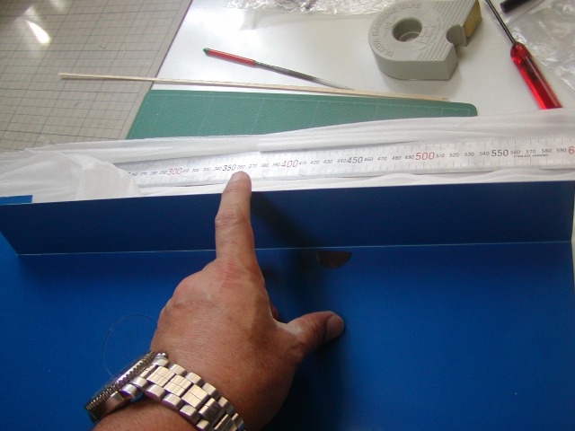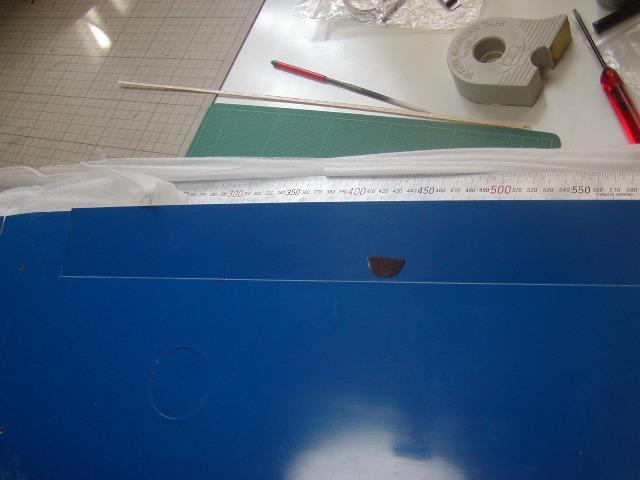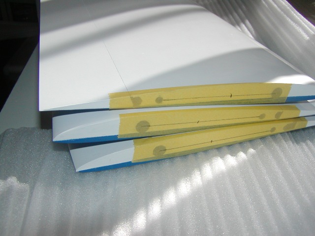 | エルロンのヒンジラインの位置を中央翼のフラップの罫書がある位置にあわせてしるしをつけます。 (中央翼には上面カット位置がマジックで書かれています。) |