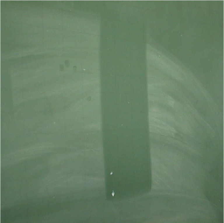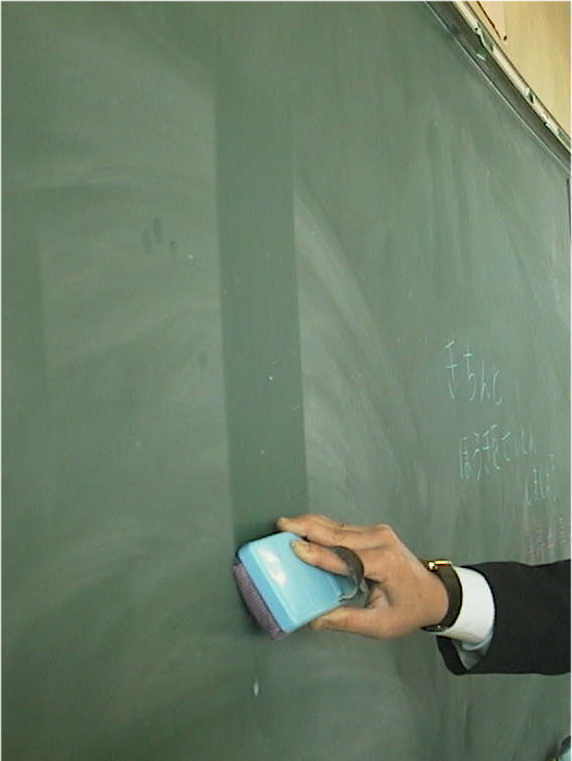 私は,黒板は「上から下に縦に消す」ことを基本としています。横に消すこともありますが,その場合も最後は縦に消し直します。「上から下に縦」に消すと黒板が締まって見える(少なくとも私には)からです。また,チョークの粉も自然に下に落ちていき,便利です。