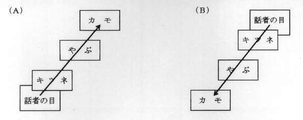 上記の文章の「キツネ」と「カモ」と「話者」の位置関係を示す図において、子ども達の思考の目を知るために、私は、(A)・(B)二種類の図を提示し、次のように発問した。