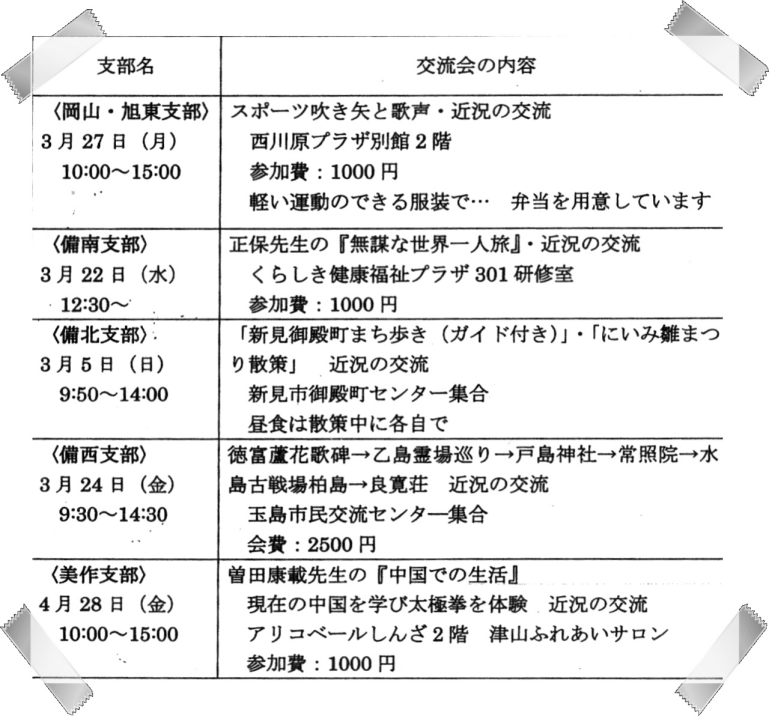 高退教会報バックナンバー第149号 2017年4月(抄) 目 次 -退職者慰労の会に参加して- どう深める教職員の連携岡山高退教会長 萱 栄次去る3月20日、高教組主催による「退職者慰労の会」に藤原斌事務局長とともに参加させていただきました。現在の教育現場の困難な状況はよく聞かされていましたが、それとあわせて、驚いたのは、定年退職後の生活です。 ほとんどの方は、フル(またはハーフ)など、何らかの形で学校とのかかわりを続けられ、現役時代はもとより、退職後も、厳しい生活環境におかれている現実です。私たち退職教職員は、どのように彼らとの絆を深めればよいのかと思いました。 会の中では、「ひとりぼっちの退職教職員にはならない」「ひとりぼっちの退職教職員をつくらない」という私たち高退教のスローガンに共感していただいたのか、会場から、「高退教に加入します」の声をいただき、勇気づけられた一幕もありました。 この日、私にとって、特に脳裏に残っている言葉がありました。藤原氏の「高退教は親睦・交流が7分、運動3分」の団体です。しかし、今は「安倍さんのおかげで「運動8分」となっていますとの言葉です。 いつもは、そのまま受け流すのですが、「そうだ、一日も早く」元のように運動3分の時代にするための運動が重要であることを強く感じたものです。 多彩に、元気に、睦まじく―岡山高退教支部別「春の交流会」―高退教各支部恒例の春の交流会が、下記のとおり開催されました。各支部の交流会の模様について、記事を寄せていただきましたので、開催日順にご紹介します。 なお、開催日の関係で、美作支部の記事は次回掲載の予定です。